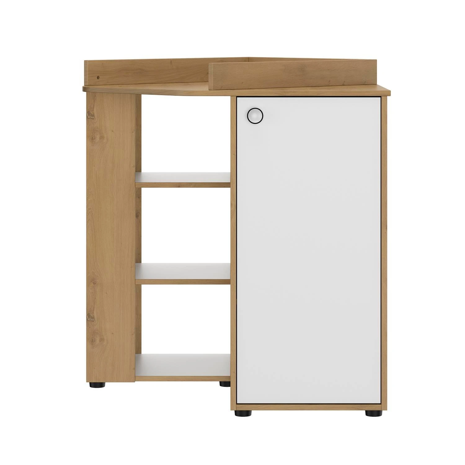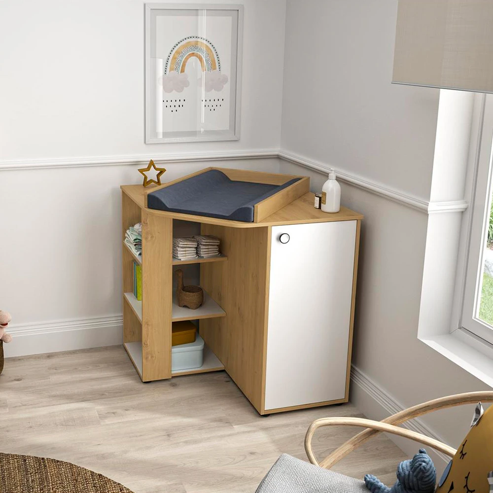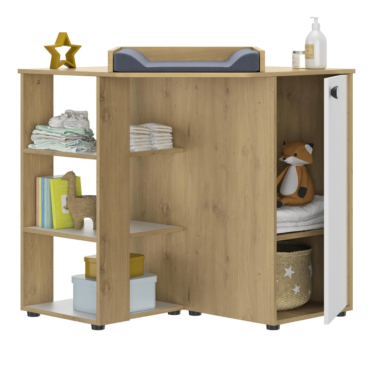 Son dispositif à langer large et sécurisé dispose de grands espace de part et d’autre pour ranger les affaires de toilette de bébé. Fonctionnel le meuble à langer d’angle est idéal pour garder à portée de main les indispensables de bébé.