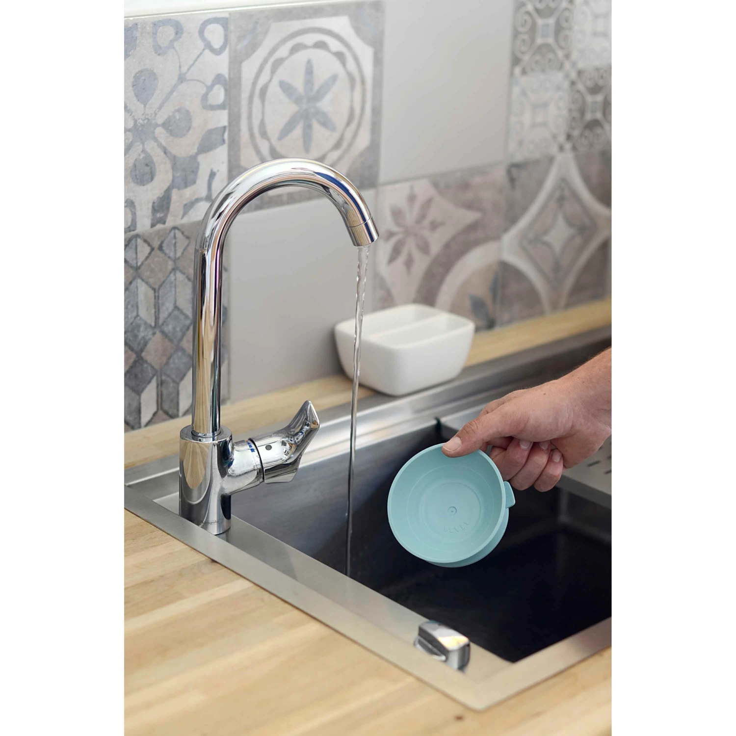 - Ventouses sous les assiettes et le bol : pour adhérer à la table et limiter les incidents.