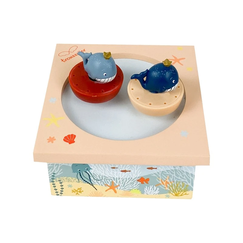 Cette jolie boite à musique en bois est accompagnée de 2 figurines aimantées. Cette boîte à musique très colorée est en peinture et sérigraphiée à la main. Ce jouet est conseillé pour les enfants à partir de 12 mois. Il faut actionner le mouvement musical situé en dessous de la boite puis mettre les figurines sur le « dancing » aimanté afin qu’elles puissent danser devant les yeux émerveillés de votre enfant.