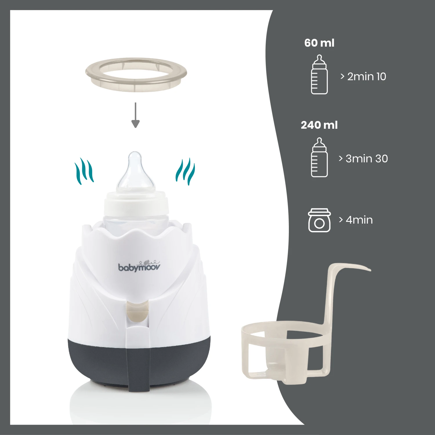 - Chauffe rapide : 2min10 pour un biberon de 60 ml, 3min30 pour 240ml et 4min pour un petit pot (la matière et l’épaisseur du biberon, la présence de fond amovible sont des éléments qui peuvent influer sur la température du biberon)