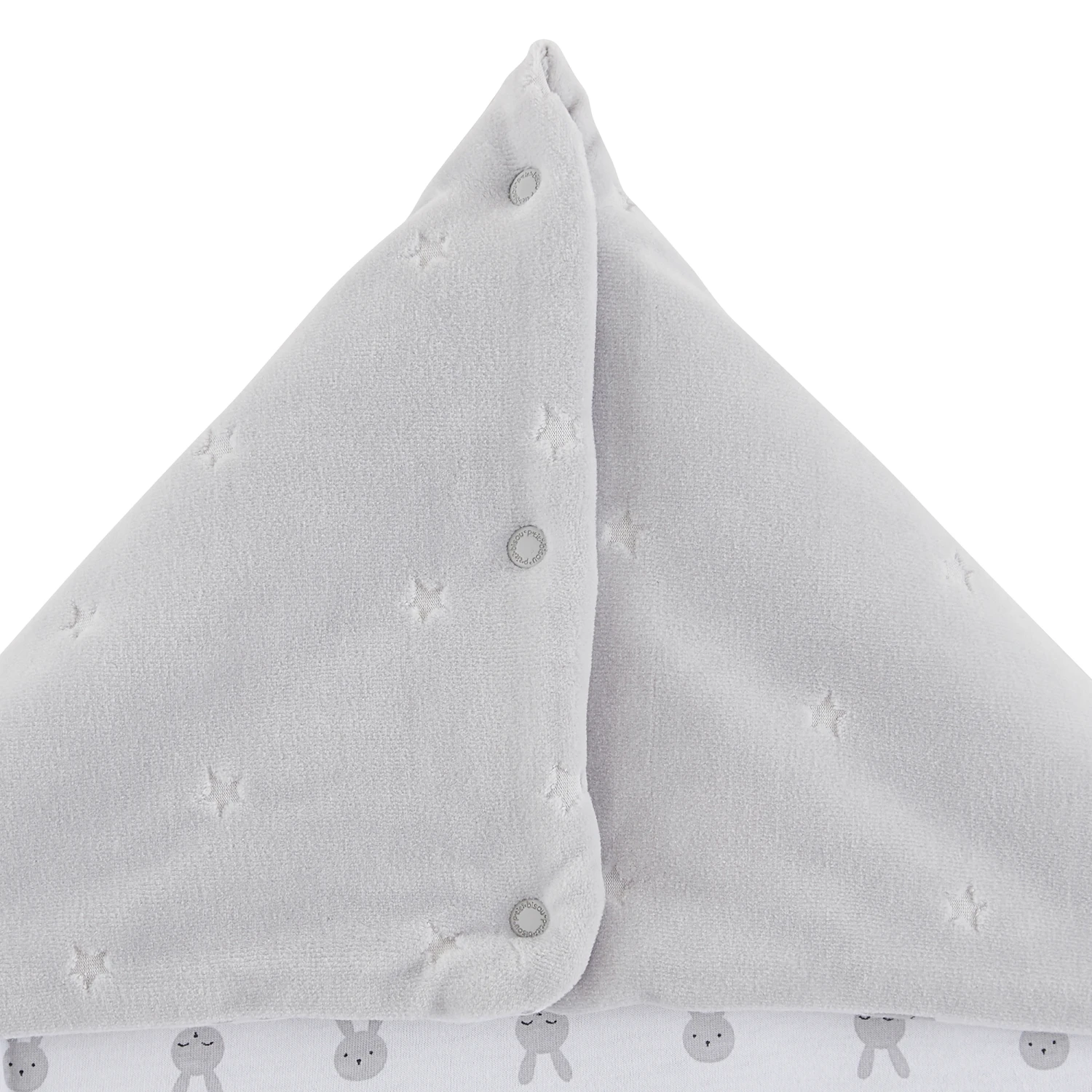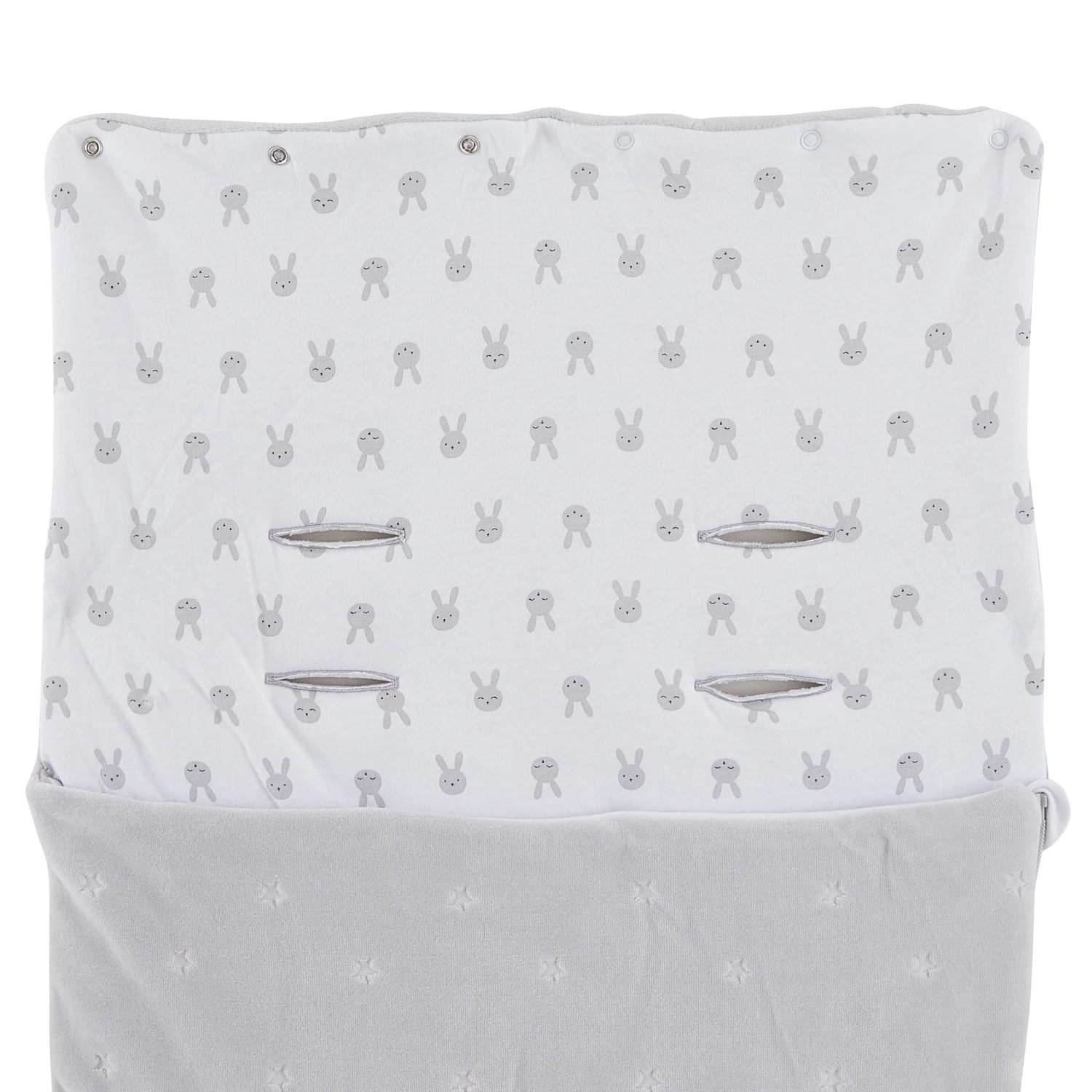 Nid d’ange P’tit bisou en fausse fourrure toute douce en coloris gris. Cette pièce, qui est un joli sac de couchage pour tout petit bébé, est très chaude car doublée de jersey blanc avec son imprimé « petites têtes de lapins » en gris et en plus elle est doublée de ouate. Cet accessoire est très affectif et ludique avec sa capuche en forme pointue d’où dépassent 2 oreilles de lapins qui font référence à notre mascotte du thème ! Cette capuche, qui maintiendra la tête de bébé bien au chaud, peut être ouverte par les pressions pour avoir une forme plus plate. La fonctionnalité n’est pas omise avec son ouverture quasi totale par un zip côté qui permet d’ouvrir entièrement bébé sans trop le manipuler et le mettre à l’intérieur.