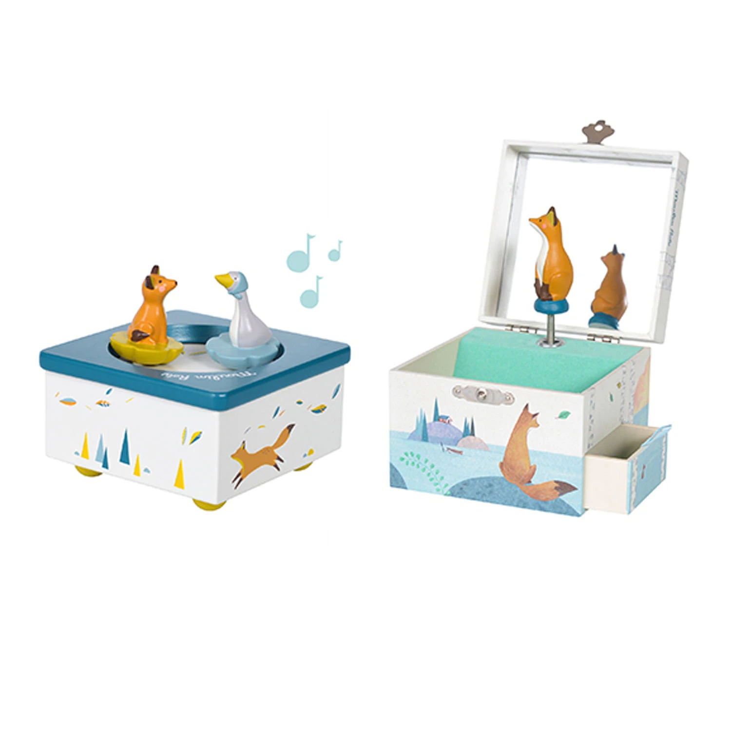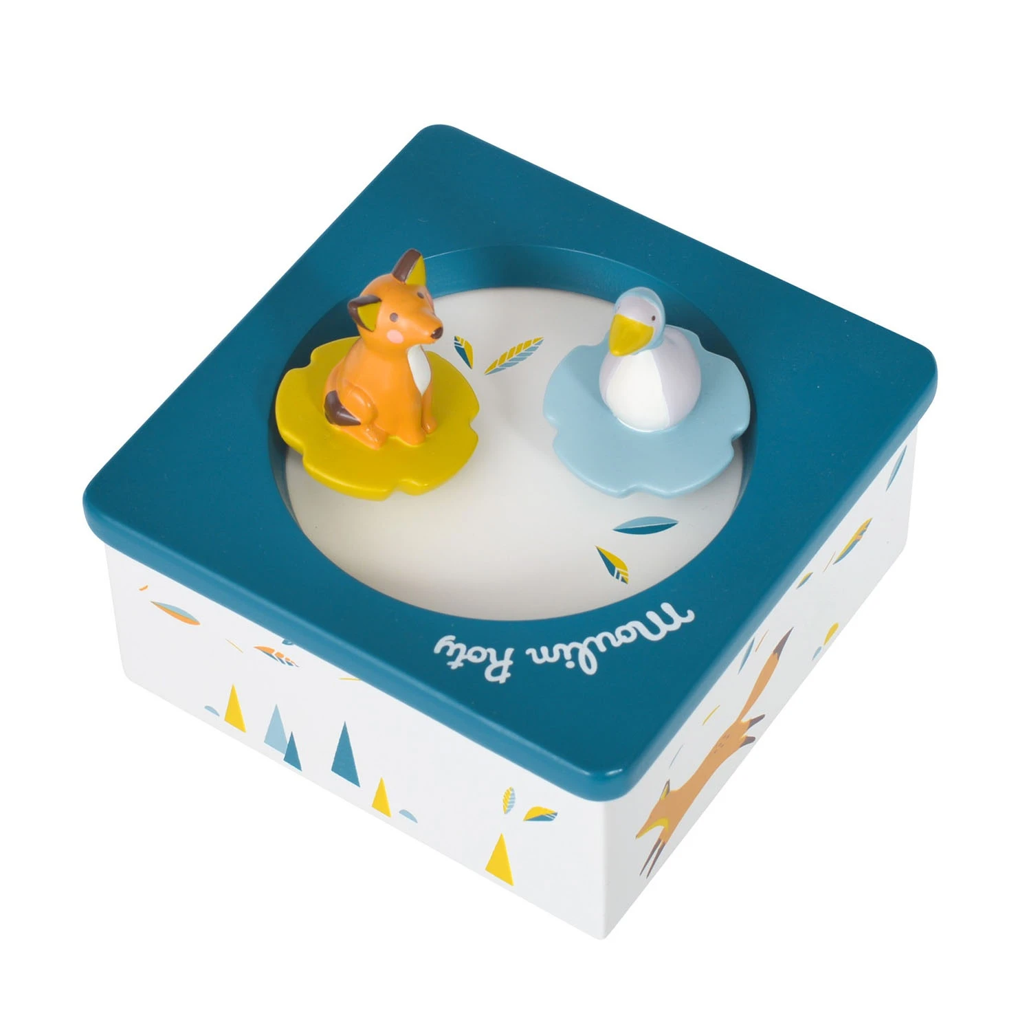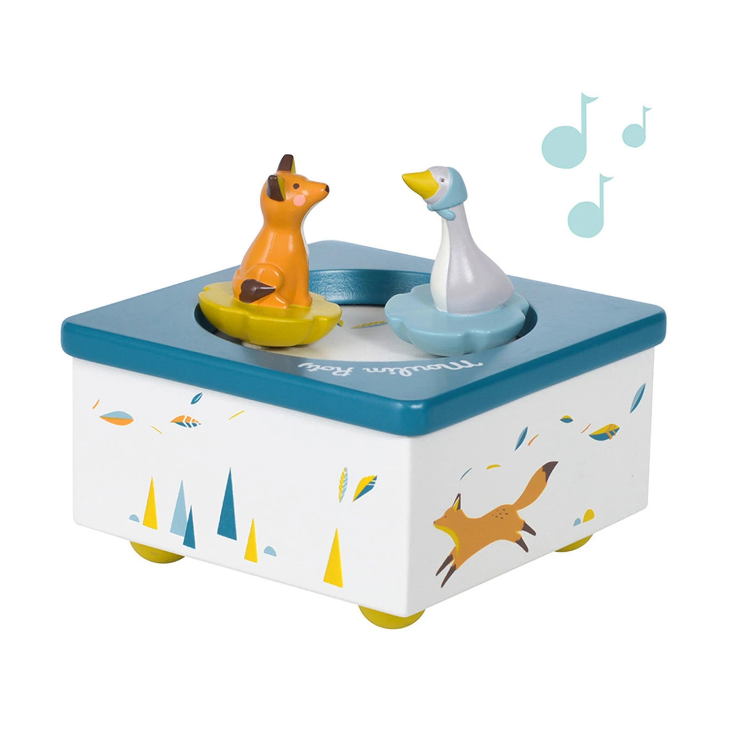 La jolie boîte à musique de la collection Le Voyage d’Olga de Moulin Roty est un bel objet décoratif qui émerveillera petits et grands grâce à sa douce mélodie. La boîte à musique intègre deux petits personnages, Olga l’oie et Chaussette le renard, qui dansent sur la musique.