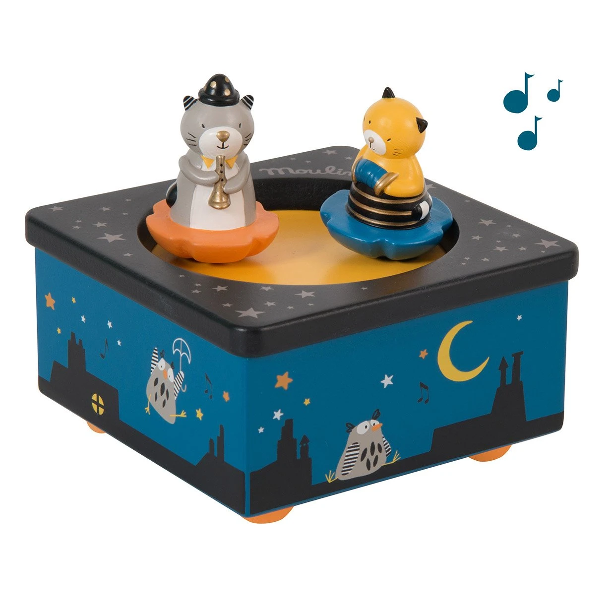 Boîte à musique Les Moustaches avec un paysage nocturne, les illustrations mystérieuse et poétiques de la gamme : concert avec les deux musiciens, qui tournent et dansent pour bercer et endormir bébé