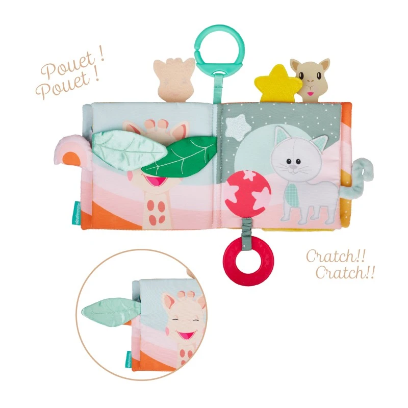 8 pages d’activités pour éveiller la curiosité et les sens de bébé ! Les parties qui dépassent du livre incitent bébé à tourner les pages et à découvrir différentes surprises: Kiwi l’oiseau qui se cache derrière un nuage, Sophie la girafe qui joue à cache-cache avec les feuilles, la pyramide de sable crépitant…