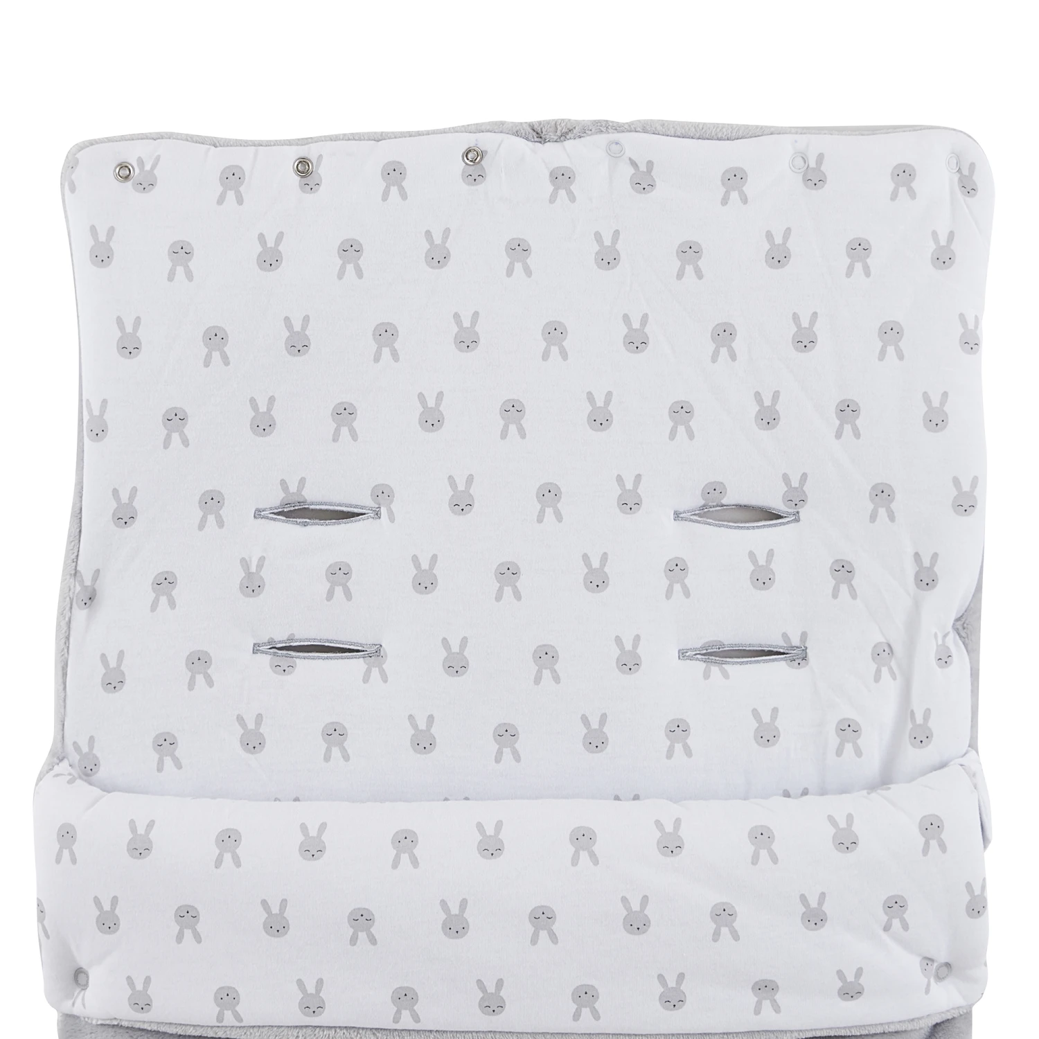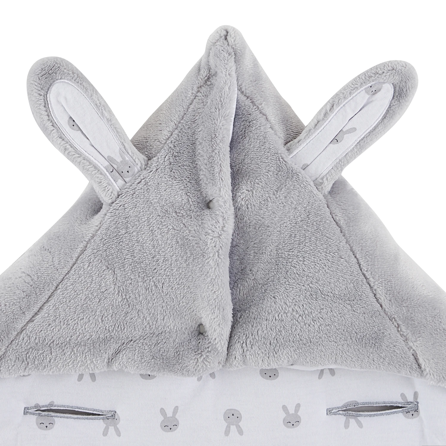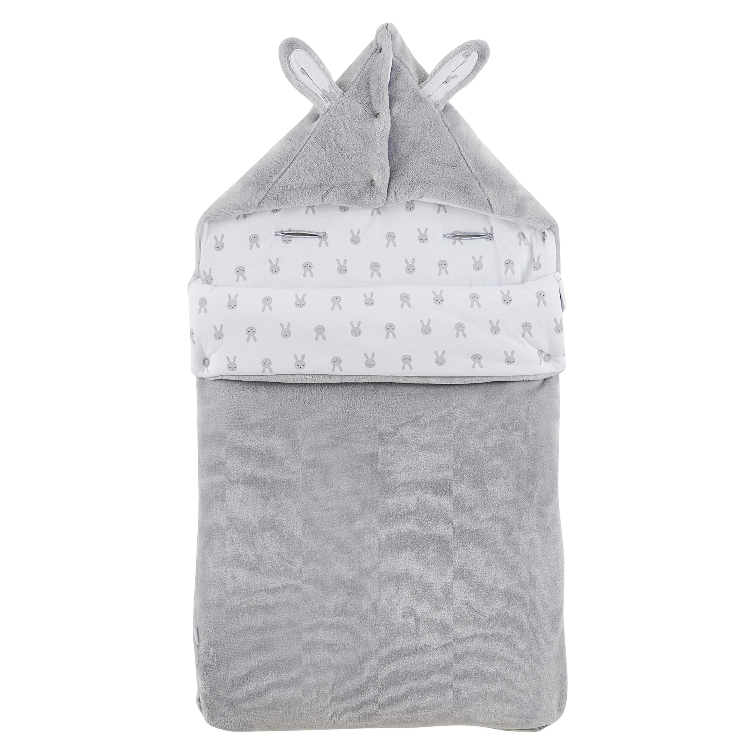 Nid d’ange P’tit bisou en velours à motifs jacquard tout doux en coloris gris. Cette pièce, qui est un joli sac de couchage pour tout petit bébé, est très chaude car doublée de jersey blanc avec son imprimé « petites têtes de lapins » en gris et en plus elle est doublée de ouate. Cet accessoire est très affectif et ludique avec sa grosse tête de lapin absolument craquant en fausse fourrure très douce devant. Bébé va adorer son beau doudou avec ses grande oreilles sur son nid d’ange. ! La capuche en forme pointue qui maintiendra la tête de bébé bien au chaud, peut être ouverte par les pressions pour avoir une forme plus plate.