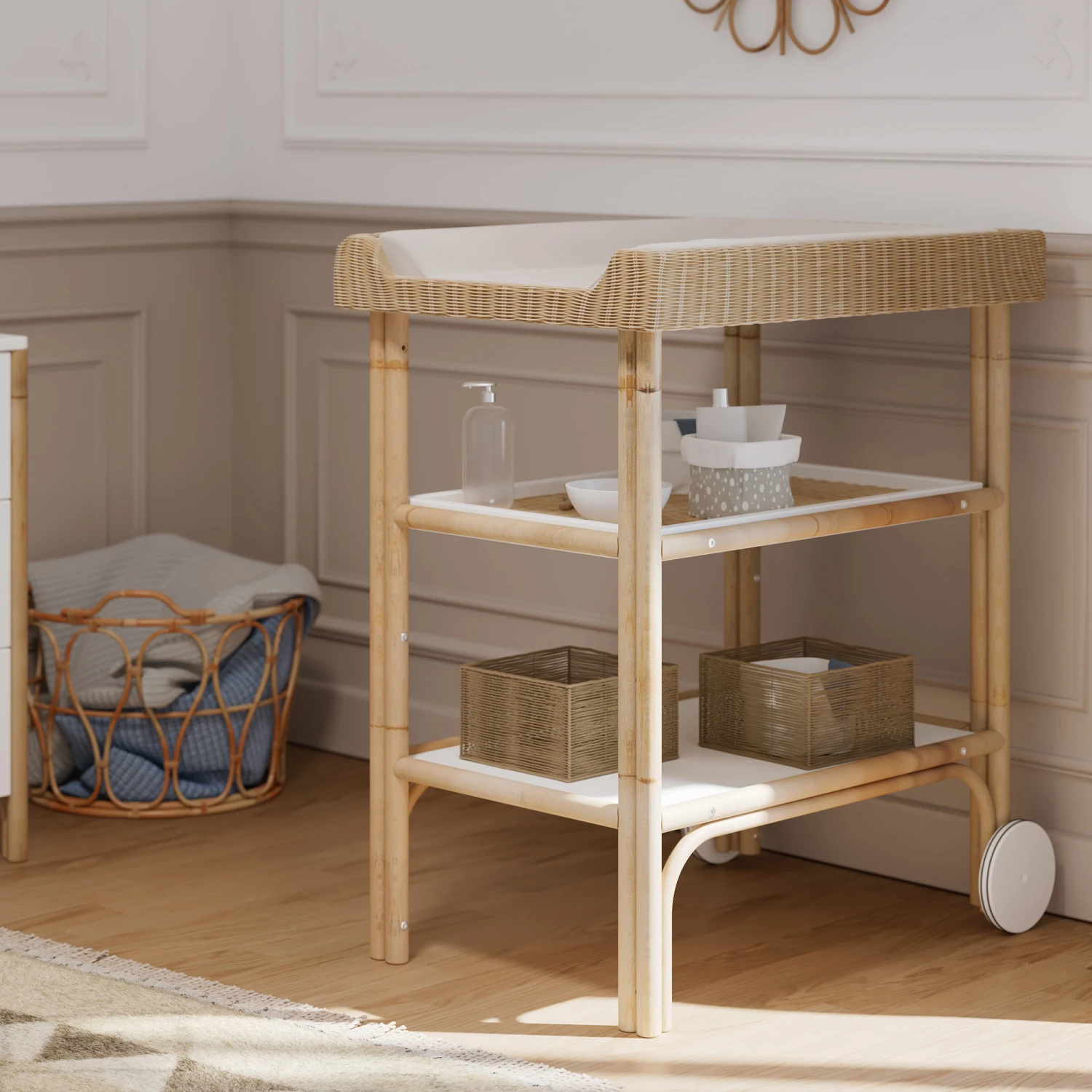Assortie au reste de la chambre Océania, cette ravissante table à langer possède deux étagères sous le plateau. Avec ses deux roues, elle peut facilmeent suivre bébé dans les différentes pièces de la maison. Les montants sont en canne de rotin naturelle, les planches en MDF et le contour du plan à langer en rotin tressé naturel. Son plan à langer accueille un matelas de 52 x 75 cm (non fourni).