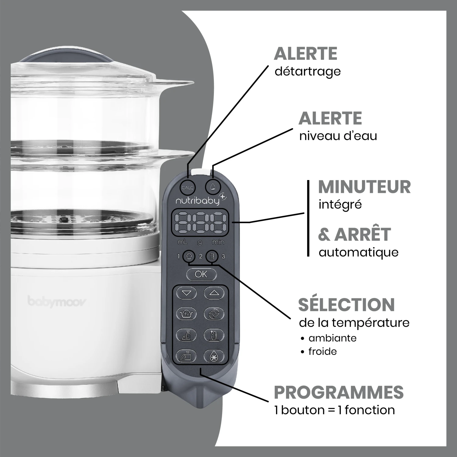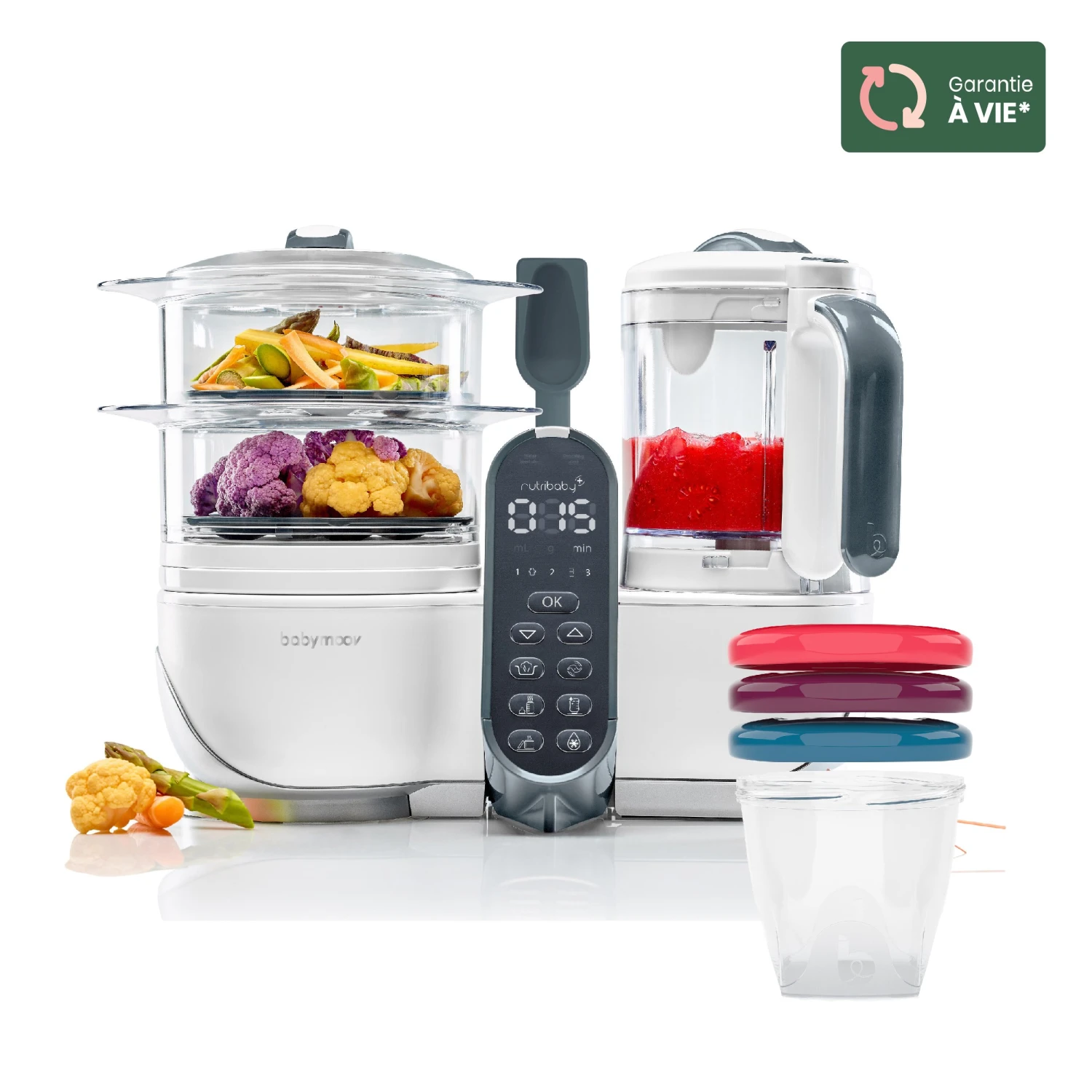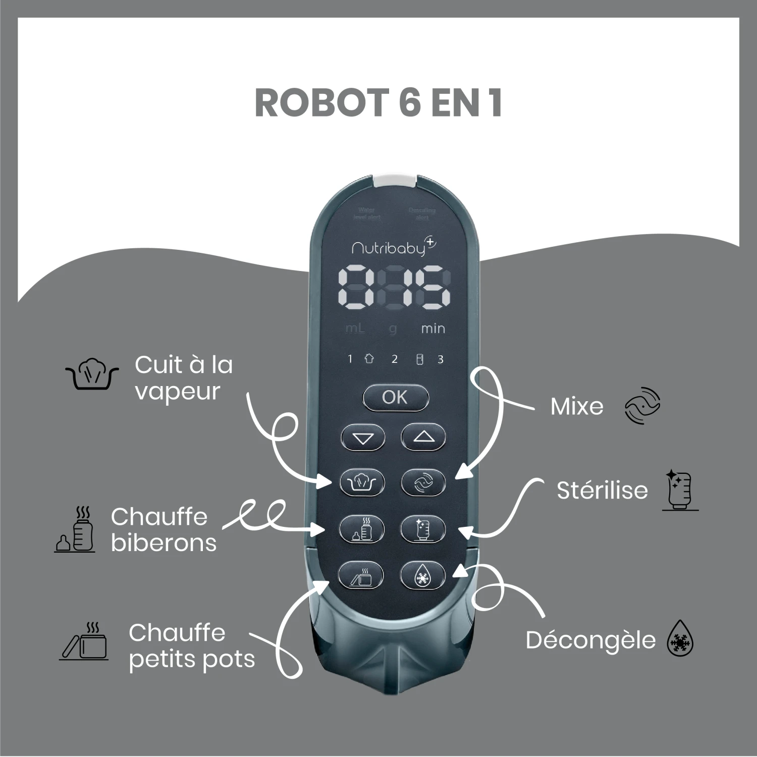 - Robot multifonctions bébé 6 en 1 (fonctions pré-programmées) : cuisson à la vapeur, mixage, décongèlation, stérilisation et chauffe-biberons et chauffe petits pots
