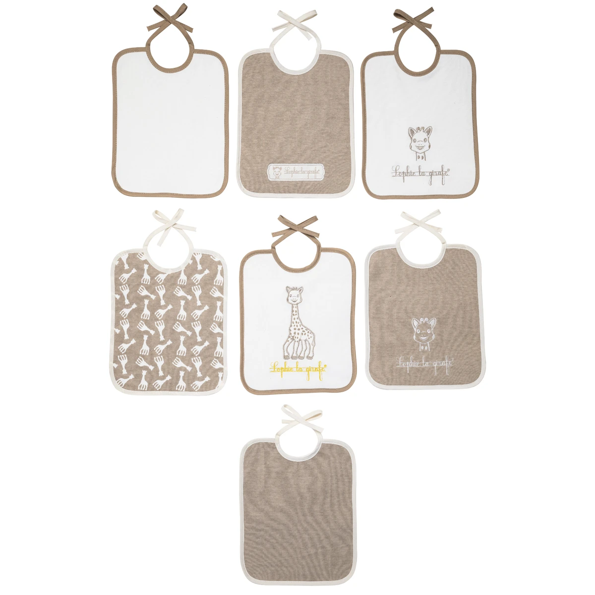 Lot de 7 bavoirs naissance de la collection Sophie la Girafe, attache à lacets.