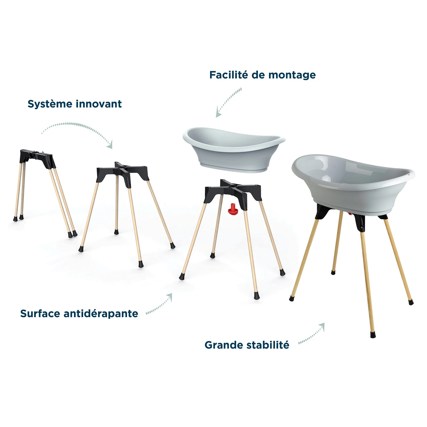 Le pack 5 en 1 est disponible uniquement en gris charme. La baignoire peut être utilisée sur le support jusqu’à ce que l’enfant essaie de se tenir debout tout seul.