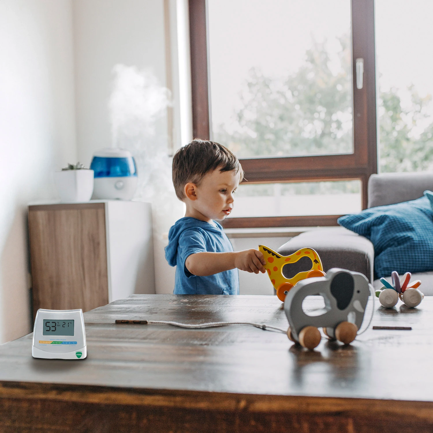 - Aide à maintenir un taux d’humidité entre 40 et 60%, ce qui représente un niveau optimal pour réduire la survie des virus de la grippe sur les surfaces et dans l’air.